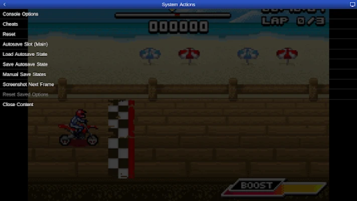The bike racing game Motocross Challenge is included courtesy of developer David Doucet. No other ROMs are included with this app and must be supplied by the user. It supports Android's storage access framework for opening files on both internal and external storage (SD cards, USB drives, etc.)